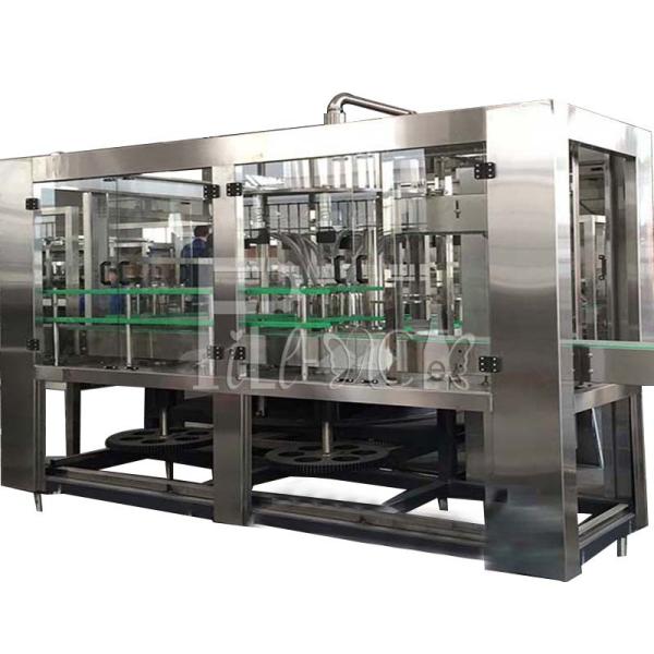 Bottle fed by a star wheel into the bottle filling machine, filling area to reach the starting point, the roller bottles along the cam will hold up, start filling valve for filling a bottle, and with the body, etc. together synchronously rotating; bottles arrive irrigation end point loading zone, to reach the cam roller bottles with low self-reset Close filling valve, filling the end of the barrel with the star wheel sent out of the bottle filling machine.